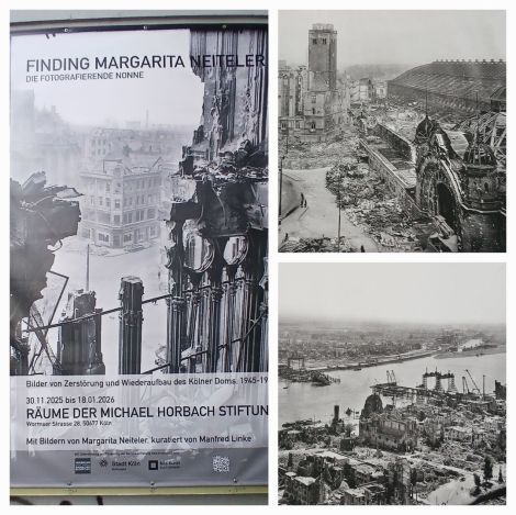 Noch bis zum 18. Januar 2026 zeigt die Horbach-Stiftung die Fotos der weitgehenden unbekannten Ordensschwester Margarita Neiteler, der „Dom-Fotografin" (Jg. 1913) . "Ende des 2. Weltkriegs dokumentierte sie die Schäden und den Wiederaufbau des Doms auf hohem fotografischem Niveau. Ihre einzigartigen Aufnahmen, heute zum Teil im Bestand des Historischen Archivs mit Rheinischem Bildarchiv, zeugen von ihrem Talent und ihrem Blick für historische Momente. Trotz ihrer künstlerischen Bedeutung blieb ihr Lebenswerk lange Zeit unentdeckt und weitgehend unerforscht," so der Ausstellungsprospekt … wirklich erschütternde Ansichten.