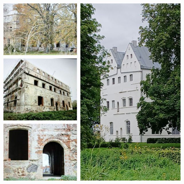 Am 25. Oktober 2013 entdeckte ich die Ruine Üselitz im Süden von Rügen, eine Baustelle erfreulicherweise, nicht mehr nur Ruine (unten links) Trotz entsprechender Verbotsschilder konnte ich außen und innen die Sanierungsarbeiten bestaunen. Nun las ich, dass alles in Topzustand ist, also heute Besuch. Es blieb beim Versuch, denn alles ist hermetisch abgeschlossen und überwacht. Schade.