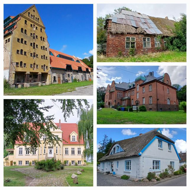 Heute zur Abwechslung mal wieder eine kleine Rundfahrt im Westen von Rügen. Alte Gebäude, steinerne Gedächtnisse ... wie ein verfallener, riesiger Speicher in Lanckensburg, der nun saniert und umgebaut werden soll (Eigentumswohnungen für Feriengäste ab 259.000 €), ein völlig verfallenes Gutshaus in Breetz, das nicht mehr zu retten ist, ein völlig intakter Gutshof mit stattlichem Gutshaus, zahlreichen Kuhställen und Speichern in Betrieb in Libnitz, schmucke alte reetgedeckte Häuser in Breege und ein saniertes Gutshaus in Grubnow (im Uhrzeigersinn).