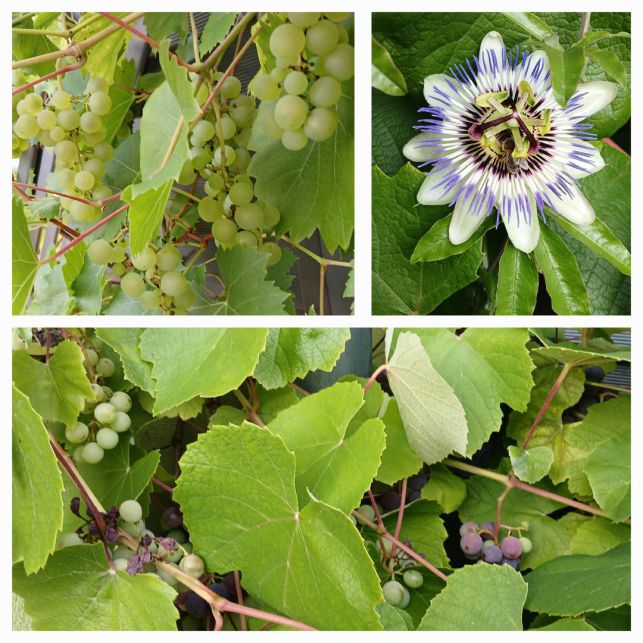 Erstaunlicher Stand der Weinreben auf meiner Terrasse - jetzt noch die nächsten zwei Wochen mit den erwarteten tropischen Temperaturen … und dazwischen aus der Nachbarschaft in diesem Jahr die Blüten von Passionsblumen, was für ein Anblick!