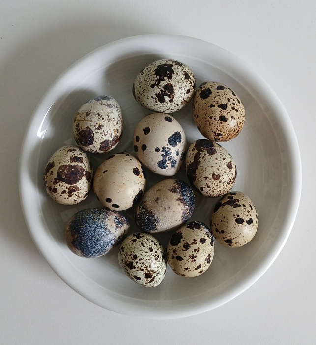Sind sie nicht wunderschön? Die Wachteleier meiner Nachbarn! Werde ich Sonntag meinen sicherlich staunenden Gästen servieren. Wo früher bei meinen Nachbarn noch das Sandkastenpiratenschiff stand, da steht jetzt ein Wachtelgehege, ein originelles Hobby!
