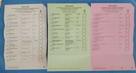 Heute endlich die Briefwahlunterlagen im Briefkasten. In Köln für jeden drei Stimmen, OB, Rat und Bezirksvertretung. Dafür war ich ja einige Tage in Ostheim für die SPD unterwegs. Für mich ist es absolut schwierig, einen Tipp für den Ausgang abzugeben. Dazu liegen in Köln drei Parteien zu nah beieinander. Und am Wahltag bin ich gar nicht in Köln ...