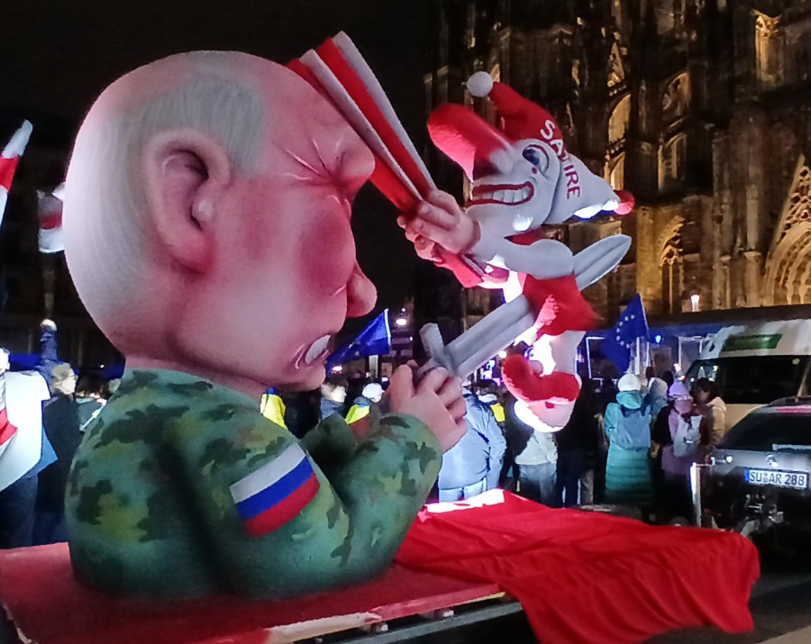 Eine klare Botschaft von Amnesty International: "Am 24. Februar 2022 startete Russland seinen völkerrechtswidrigen Angriffskrieg auf die gesamte Ukraine. Seitdem erreichen uns aus der Ukraine jeden Tag kaum zu ertragende Nachrichten und Bilder von schwersten Menschenrechtsverletzun-gen. Menschenleben, Lebensgrundlagen, Häuser und Infrastruktur wurden zerstört und Familien auseinandergerissen. Millionen von Menschen sind auf der Flucht. Amnesty International hat ein Muster von Kriegsverbrechen durch russisches Militär dokumentiert. Russische Truppen greifen wahllos Wohngebiete, Krankenhäuser und Schulen an und erschießen gezielt Zivilpersonen auf offener Straße. Die Verantwortlichen für diese Taten müssen vor Gericht gestellt werden." So auch heute die Botschaft der Demo vor dem Kölner Dom … hier einer der Karnevalswagen des Düsseldorfer Satirikers Tilly.