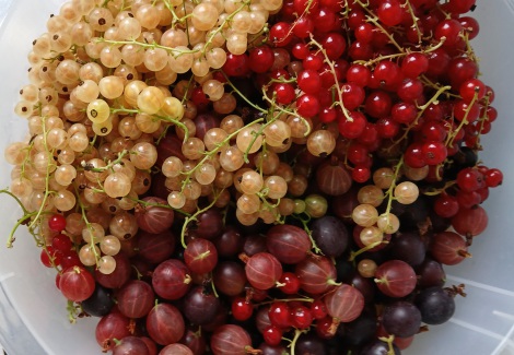 Die Erntezeit beginnt mit Beeren: weiße, rote und schwarze Johannisbeeren, auch rote Stachelbeeren und schon dunkle Jockelbeeren ... die meisten sind aber noch unreif, ebenso die grünen Stachelbeeren. Die Kirschernte hier bei mir in Waren ist dürftig, bei Nachbar Jürgen eher Durchschnitt; aber bei seinem riesigen Kirschbaum kommt man an die meisten Kirschen gar nicht ran. In Köln gibt's wieder Süßkirschen reichlich, die Sauerkirschen sind fast reif.