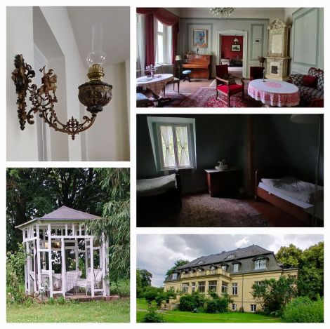 Da konnte ich nicht nein sagen: da Anja mit der Eigentümerin des Gutshauses Belitz verabredet war, hatte sie mich eingeladen mit dorthin zu kommen. Schließlich kannte ich das bekannte Gutshaus nur von außen. Dabei ist das Innere ein echtes Kleinod. Denn drei historische Filme bzw. Serien wurden hier gedreht: "Abenteuer 1927 - Sommerfrische" und "Abenteurer 1900 - Leben im Gutshaus" (beides ARD-Serien) und kürzlich "Die Herrlichkeit des Lebens" (die Liebesgeschichte zwischen Franz Kafka und Dora Diamant), der im Mai 2024 in die Kinos kam. Entsprechend originalgetreu sind Inventar und Ambiente (Collage unten). Meine 'Belitz-Seite' wird zeitnah aktualisiert ...