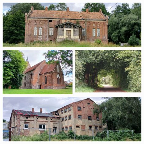 Wieder einmal Glück gehabt - nach zwei Stunden Regen komme ich in Dassow bei Sonnenschein an (Rückfahrt nach Köln mit Umweg über den nordwestlichen Zipfel von Mecklenburg). Ziel die Gutshäuser in Wieschendorf (noch ein Gutshaus mit kompletten Hof und immer noch Agrargroßbetrieb), Wilmstorf (verfallendes leergezogenes Gutshaus mit marodem Nebengebäude, in der Collage oben) und in Dassow-Kaltenhof (noch bewohntes Gutshaus ohne Sanierungsansatz mit marodem Nebengebäude (in der Collage unten) - die plakative Eigentumswohnsangebote entbehren jeder Grundlage) und Dassow-Lütgenhof (der Jägermeister-Chef Mast ließ das Gutshaus zum Hotel umbauen incl. zwei Restaurants - ein Fehlinvest; heute eine teure Privatklinik "fotografieren verboten") - unterschiedlicher können die Denkmale nicht sein! Eine Tagesreise über altes Kopfsteinpflaster, durch Alleen und 'überdachte' Straßen (in der Collage rechts) … in der Collage Mitte links: die mittelalterliche Feldsteinkirche in Dassow.
