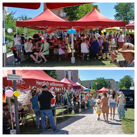 Bei strahlendem Sonnenschein (über 30°) eingeteilt am Grillstand in praller Sonne beim diesjährigen Waldbadfest ('Nachbarschaftsfest im Waldbadviertel) - mit vielen Infoständen (von der Imkergruppe Waldbad bis zu den Müllsammlern aus dem Viertel, vom 'Kindertanzen mit den Ostheimern Tanzmäusen bis zur Adipositas Selbsthilfegruppe) ... und nach anderthalb Stunden am Grill kam meine Ablösung wie gerufen. Sofort Duschen und trockene Kleidung ...