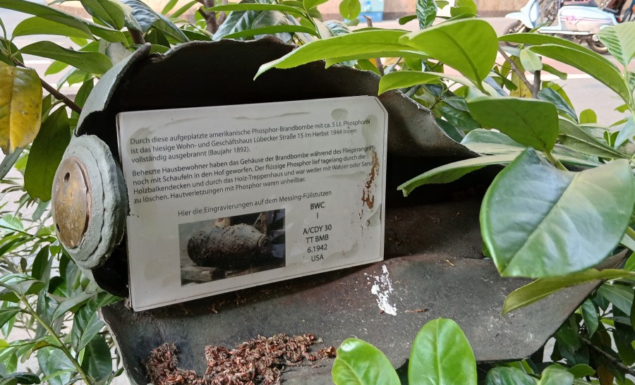 Durch Zufall im Gebüsch vor der Filmpalette in der Lübecker Straße entdeckt. Eine Phosphorbombe, ein Denkmal mit einer interessanten Geschichte: "Durch diese aufgeplatzte amerikanische Phosphor-Brandbombe mit ca. 5 Lt. Phosphoröl ist das hiesige Wohn- und Geschäftshaus Lübecker Straße 15 im Herbst 1944 innen vollständig ausgebrannt (Baujahr 1892). Beherzte Hausbewohner haben das Gehäuse der Brandbombe während des Fliegerangriffs noch mit Schaufeln in den Hof geworfen. Der flüssige Phosphor lief tagelang durch die Holzbalkendecken und durch das Holz-Treppenhaus und war weder mit Wasser oder Sand zu löschen. Hautverletzungen mit Phosphor waren unheilbar."