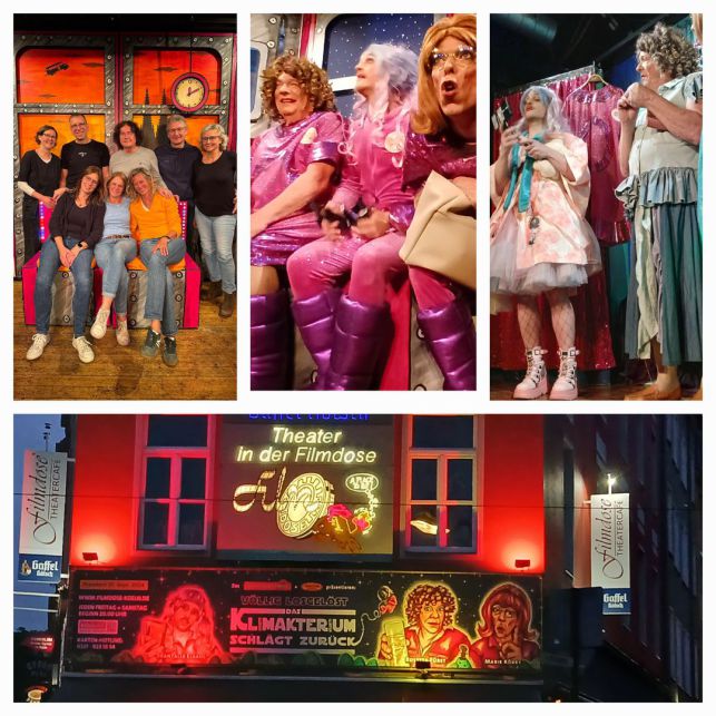 Einmal im Jahr ist Filmdosentag - in der Filmdose Zülpicher/Kyffhäuser Straße. Nicht öfter, weil die Theaterstücke meist länger als ein Jahr gezeigt werden. Das aktuelle Programm "Völlig losgelöst - Das Klimakterium schlägt zurück" muss nicht näher erläutert werden, denn jedes Stück ist auf einem einsamen Niveau. Und in alter Anhänglichkeit hatten wir bei unserem Jahresabschlusstreffen den heutigen Termin gebucht - wir, das ist wieder die 'letzte Generation' der Kyff-Mitarbeiterinnen aus 1995, in der Collage unten oben links. Nun heißt es WARTEN auf das nächste Theaterstück - aber das aktuelle läuft erst einmal bis in den Herbst.