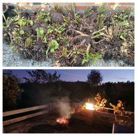 Tatsächlich 10 Stunden Sonnenschein, wie vorhergesagt. Nun ist die Hälfte der Dahlien im Keller, die andere Hälfte trocknet hier erst einmal. Es bleibt noch viel zu tun, bevor hier alles winterfest ist. Und ab 18 h muss schon ein kleines Feuer sein, damit man draußen noch sitzen kann.
