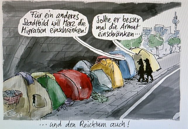 Das Stadtbild-Thema geistert durch alle Gespräche und Meldungen. Heute gab es bei Radio 1 eine Sendung zu dem Thema: Was stört dich am Stadtbild. Interessant, dass eigentlich alle Befragten konkrete Themen benannten wie Unsauberkeit oder Obdachlosigkeit. Und die Lösungsvorschläge gingen alle nicht in Richtung 'Remigration' oder 'Asylbewerber'. Interessant der Acht-Punkte-Plan: "Mehrere Bundestagsabgeordnete der SPD haben Vorschläge zur Verbesserung des Stadtbilds vorgelegt. In einem Acht-Punkte-Plan, über den die „Bild“-Zeitung berichtet, fordern sie Maßnahmen wie bessere Beleuchtung, intensive Sozialarbeit, mehr Drogenkonsumräume sowie eine Überwindung von Obdachlosigkeit bis 2030," so der Bericht des Deutschlandfunks. Unten die Karikatur aus Spiegel-online.