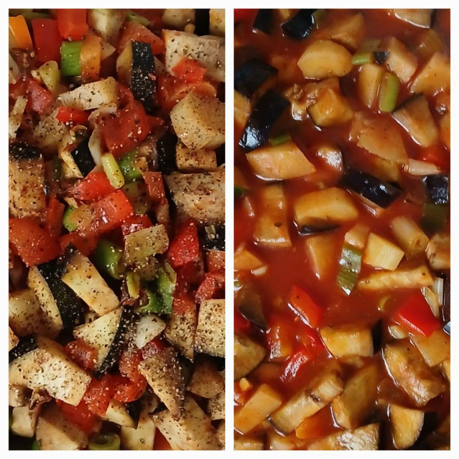 Schon wieder Nieselregen, dabei Ernte der letzten Gartenergebnisse: Rote Beete satt, Mangold ... die letzten Äpfel sind schon im Auto. Zeit für die Küche. Ratatouille steht auf der Speisekarte, zur Abwechslung mal neben Paprika, Aubergine, Zucchini, Tomaten, Lauchzwiebeln und Knoblauch eine Pastinake - allein vorab in die große Pfanne, weil mehr Garzeit.