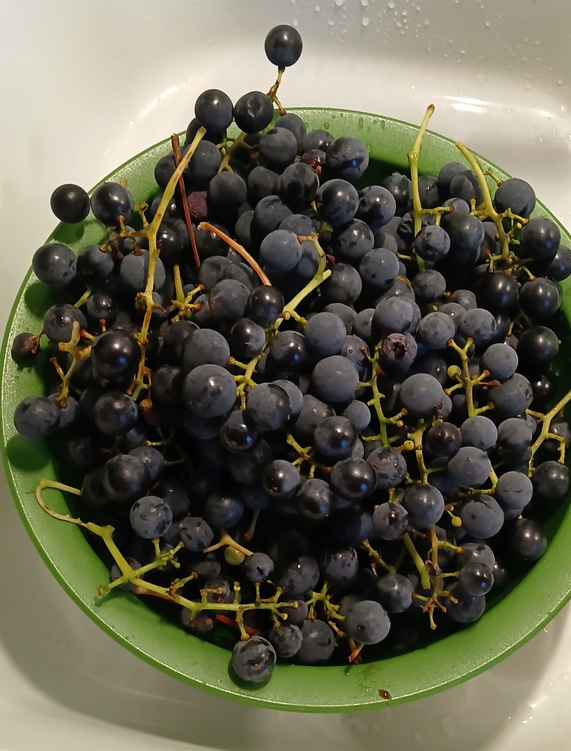 Das war ja eine Überraschung: Bei dem Wetter halte ich mich ja nicht auf der Terrasse auf, aber durch Zufall fiel mein Blick auf die 'Rotweinwand' - jetzt waren alle fast alle Blätter gefallen und legten die ungepflückten Reben frei - noch einmal habe ich mehr als 2 kg echt süße Trauben ernten können!