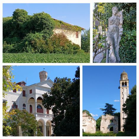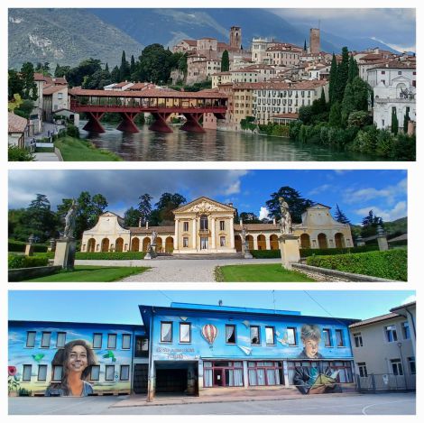 Dazu heute eine Fahrt in den Westen von Treviso, vor allem zur Villa Barbaro bei Maser, ins slte Asolo und nach Bassano del Grappa ... als Autofahrer gab's aber keinen Grappa, sondern eine fette Eiscreation ... in der Collage unten Bassano, darunter die Villa arbaro und dann die Fassade einer Grundschule in Caerano di San Marco.