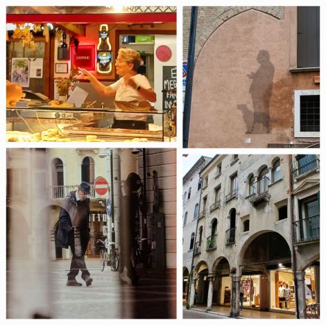 Vorher aber das richtige italienische Leben in Treviso. Der lebhafte Alltag der Einheimischen unter sich schon zum Frühstück, der einsame Alltag des Alten, die kleine Kunst mit Maschendraht am historischen Gebäude, Mode in alten Gemäuern ...