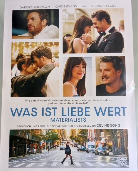 Als ich heute morgen aufwachte und mich im Spiegel sah, habe ich echt einen Schrecken bekommen. Meine linke Gesichtshälfte war geschwollen, wie ich es noch nie erlebt hatte. Zwar hatte mich der Zahnarzt meines Vertrauens darauf vorbereitet … aber was noch nicht war, warum sollte es jetzt sein. Da ich meine Umgebung nicht erschrecken wollte, habe ich mich in die Lichtspiele Kalk verdrückt: „Was ist Liebe wert – Materialists“ ist ein klassischer Wolf im Schafspelz – was sich als klassische RomCom anbiedert, entpuppt sich zumindest in der ersten Stunde als ätzende Abrechnung mit der ökonomischen Dimension des Datings. Wenn Celine Song dann aber in der zweiten Hälfte doch noch zurück zu einer klassischeren Liebesgeschichte abzubiegen versucht, kommt der Film zunehmend aus dem Tritt. Aber selbst das ändert nichts daran, dass man mit dem ebenso attraktiven wie großartig spielenden Star-Trio Dakota Johnson, Chris Evans und Pedro Pascal gern 115 Minuten verbringt," schreibt filmstarts. Aber es war eben kein Franzose, kein Italiener, sondern nur ein 'Amerikaner' mit all seinen Schwächen …
