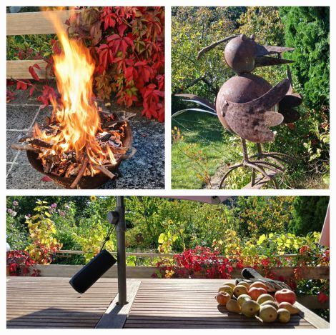 Unter ein Blick von der Terrasse in den Garten, auf das abentliche Feuer und den Rostvogel.